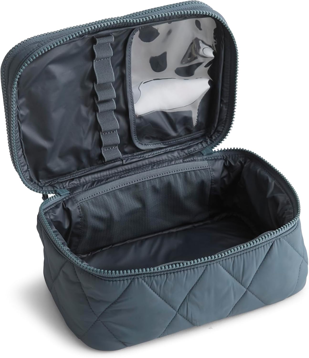 • DETAILS - Interior features two zip pockets, two slip pockets, and eight elastic makeup brush loops with a wipeable TPU cover