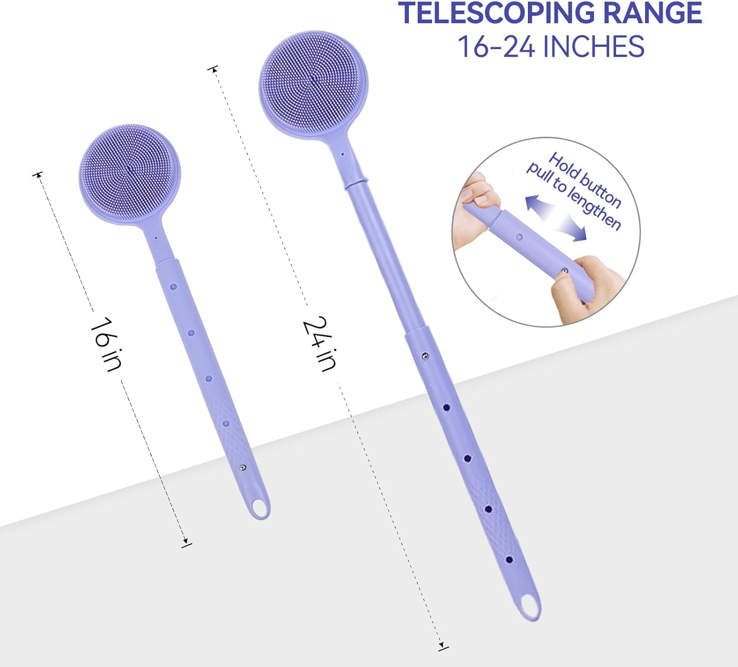 - Adjustable Long Handle with Secure Grip: Equipped with a stainless steel button for 5-level length adjustment (16-24 inches), this back brush reaches all body areas effortlessly,especially friendly to people with elderly and limited mobility. The ABS handle with anti-slip texture ensures firm control, even when wet, suitable as a back washer for shower men/women.