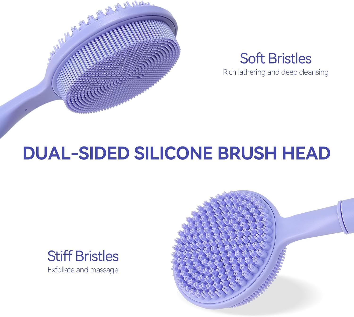 - Dual-Sided Shower Brush: One side features extra-long silicone bristles that generate rich lather for deep cleansing, gently removing dirt without irritation. The other side has massage nodes to effectively exfoliate and evokes a radiant glow to the skin, making it a versatile back scrubber and body brush for showering.