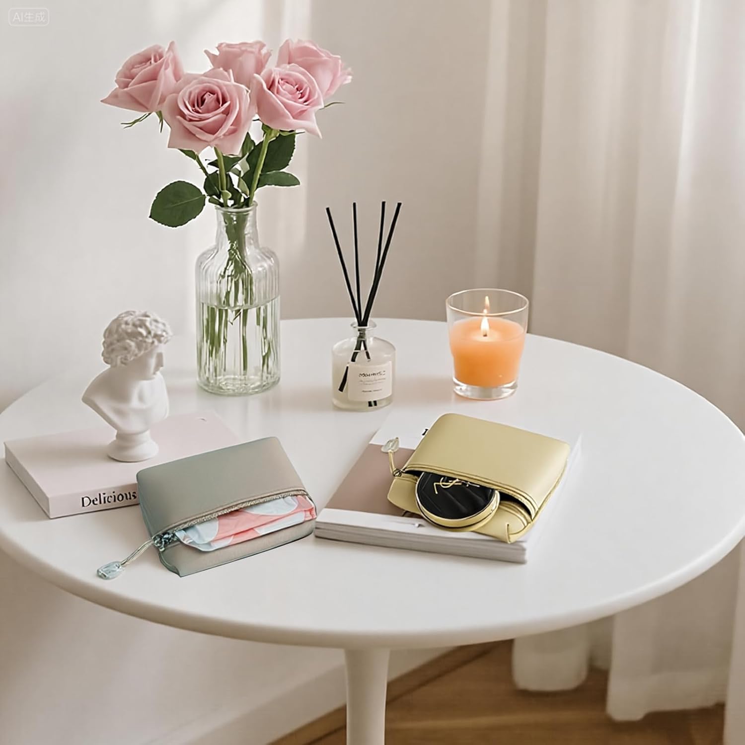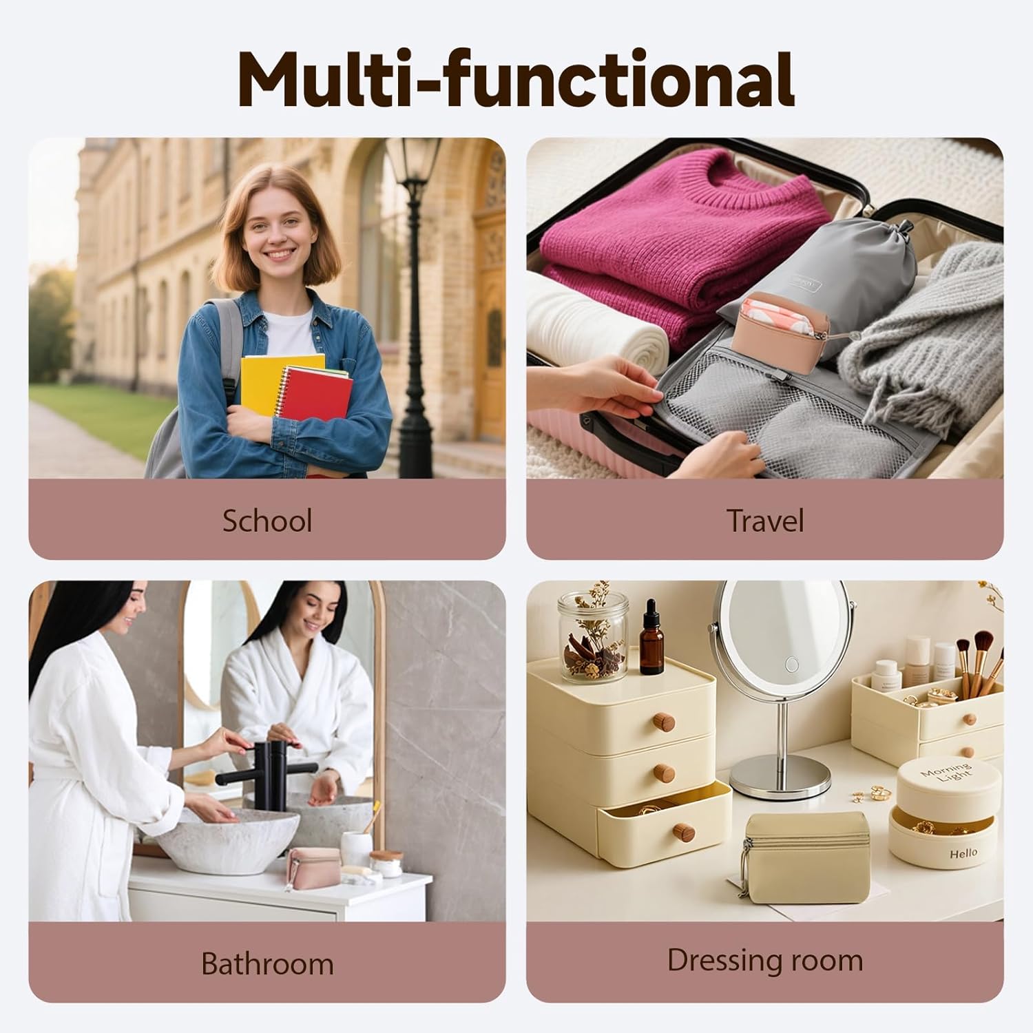 • /Multifunctional Scenes/:More than just a makeup pouch, it doubles capable of a travel organizer or coin/key pouch, and sanitary napkin storage bags,offering a cute and private way to store sanitary napkins, tampons, or liners.Used for any activities in daily life, such as on the go, shopping, work, travel, gym, everyday use etc.
