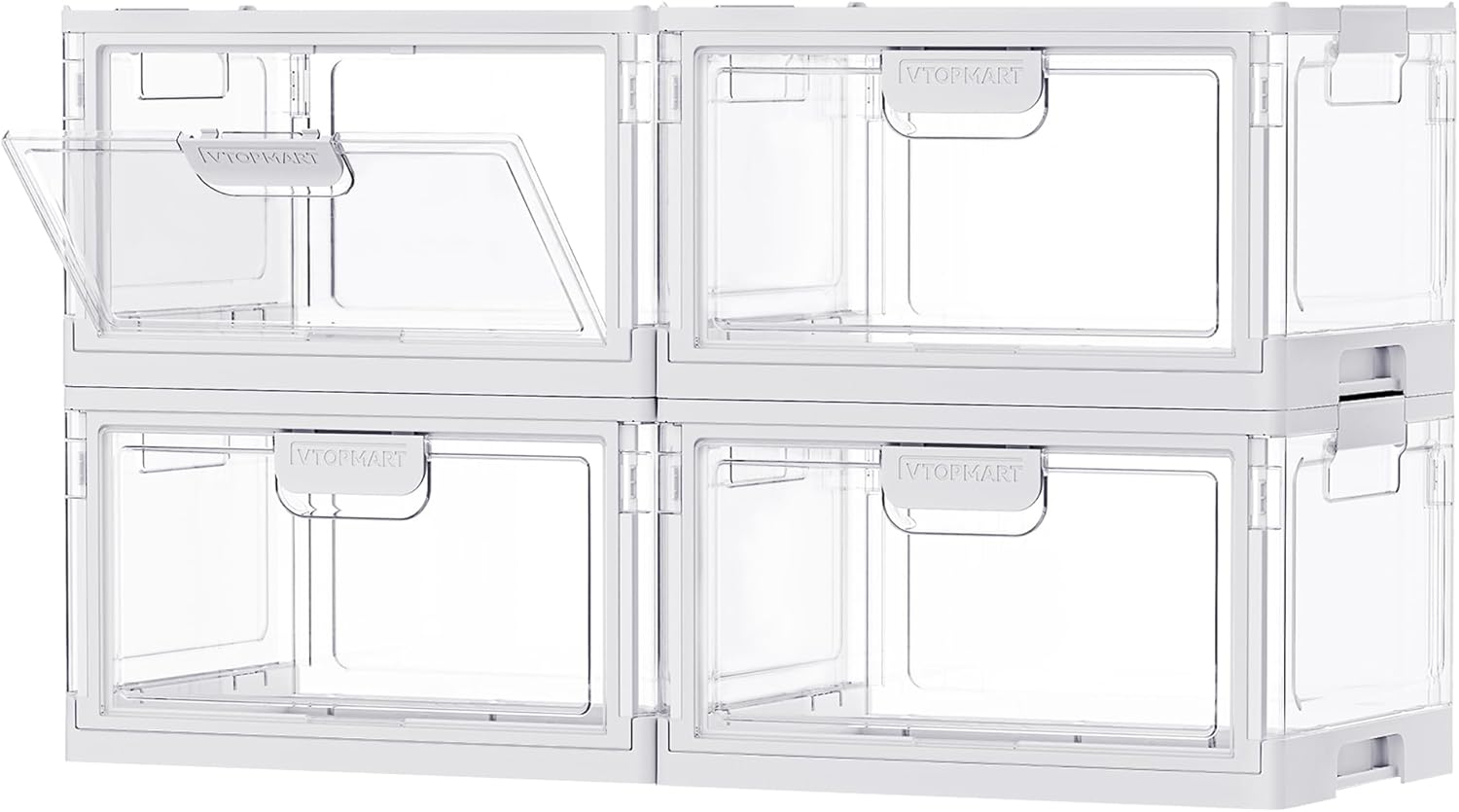 Vtopmart 4 Pack Stackable Storage Bins with Lids,24QT Clear Foldable Closet Organizer with Front-Open Doors,Plastic Storage Containers for Living Room, Bedroom, Craft Room, Dorm Organization