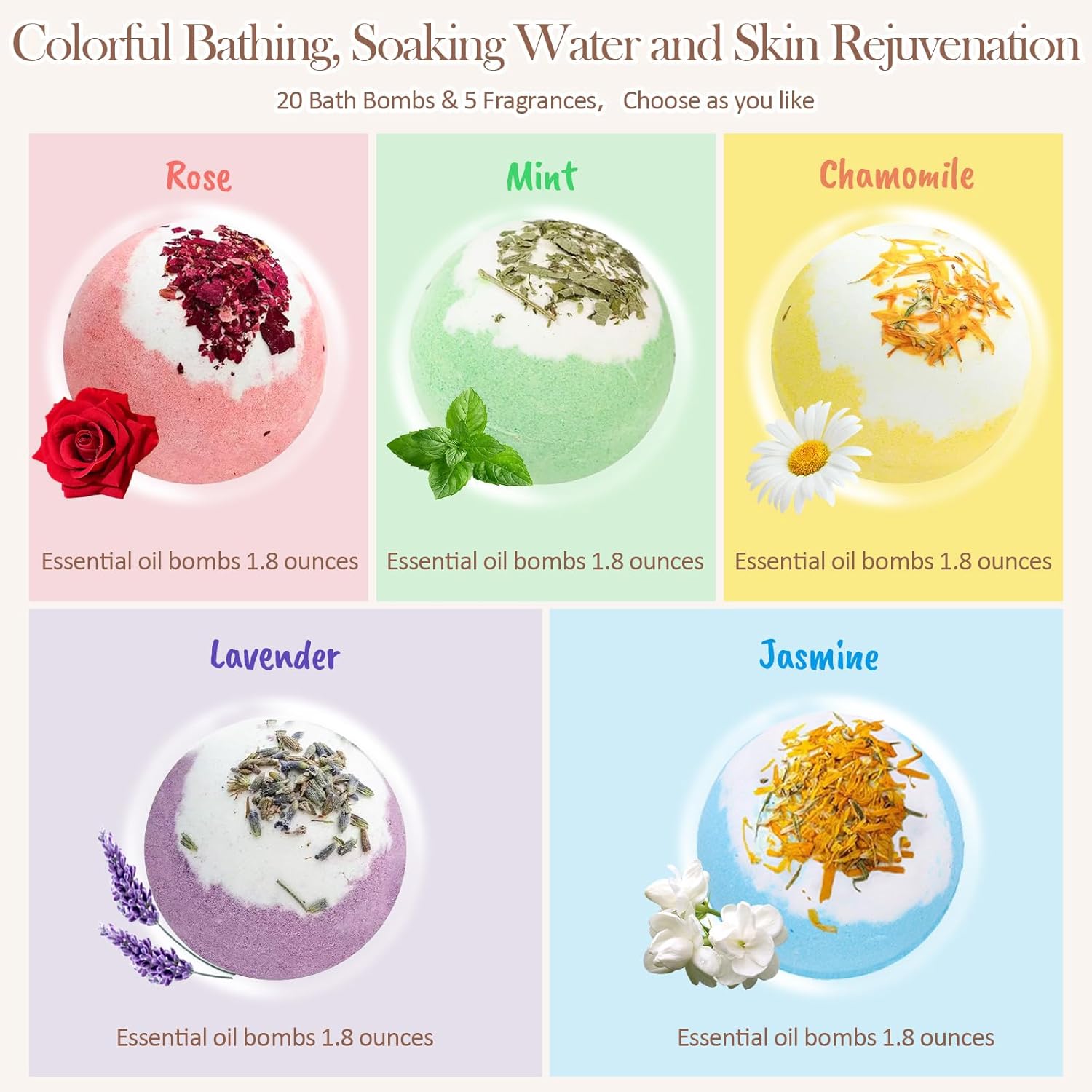 - Bath Bomb Set for Women: 20 uniquely handcrafted bath bombs in 5 captivating floral scents. Each is individually wrapped, perfect for storage or travel, making them ideal gifts for the special women in your life