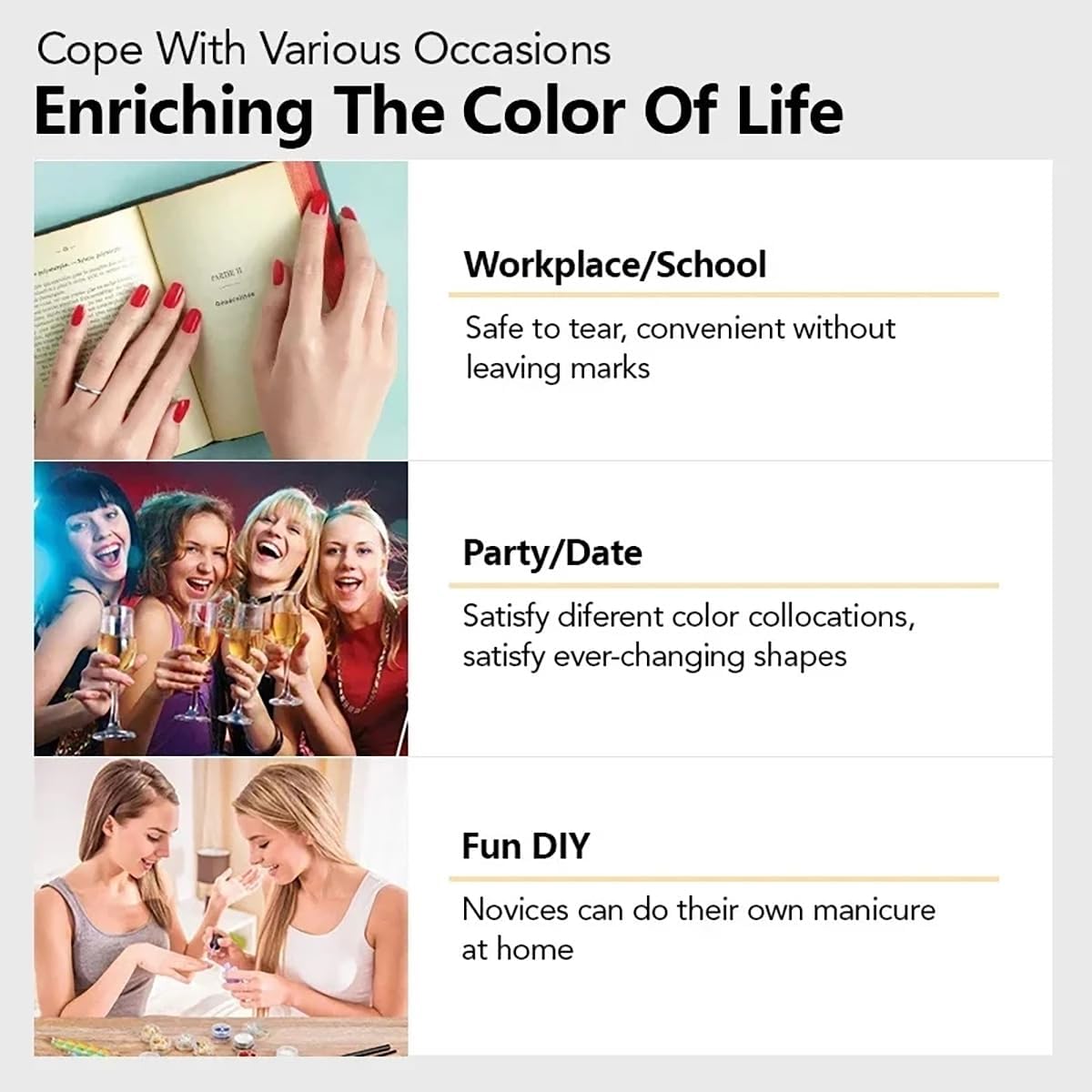 - Wide Applications: These solid color nail wraps stickers are not only suitable for experienced nail art lovers, but also for those nail art beginners, convenient operations, making manicure process much easier, can be applied for many occasions, such as dating, birthday parties, shopping and so on