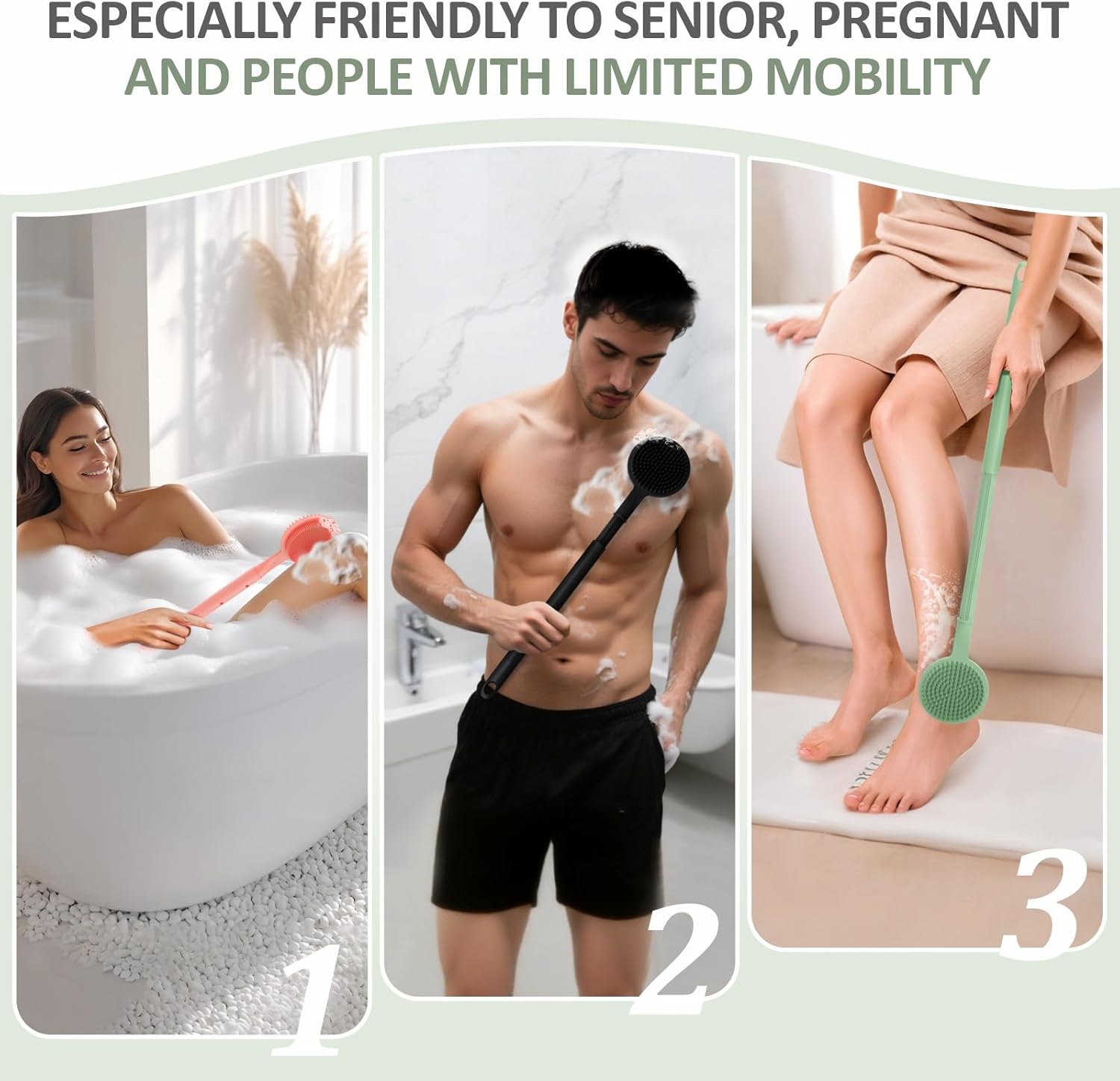 Adjustable Silicone Back Scrubber for Shower, 16''- 24'' Extendable Shower Back Scrubber for Rich Foam, 5-Length Back Brush Bath Brush with Dual-Side Head and Super-Lathering Bristles(Green)