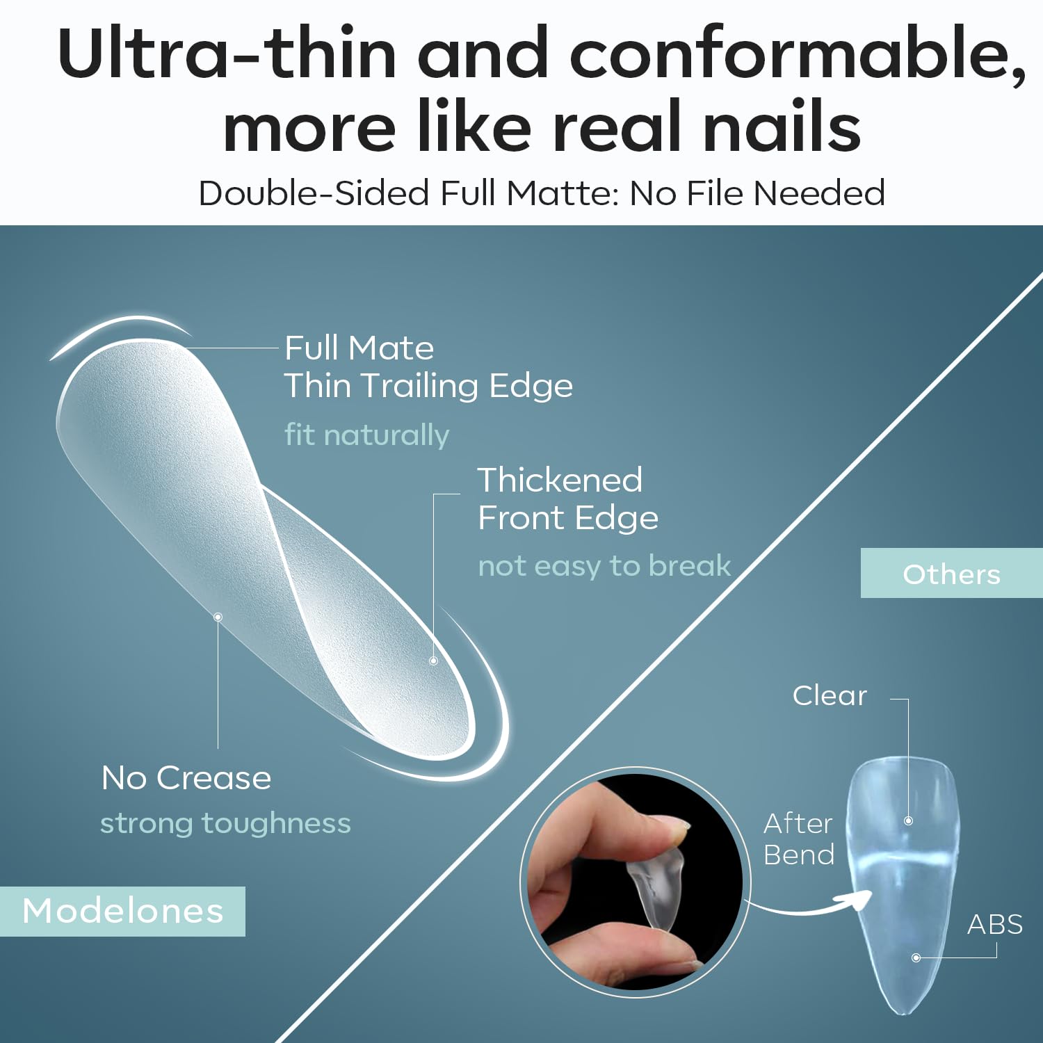 - Stronger Adhesion & Natural Nail Feeling: Modelones upgraded fully frosted texture for increased friction, which makes our soft nail gel tips feature stronger adhesion and a better fit on your nails. With high-quality soft nail gel material, strong toughness and malleability, thin and light with a thin back edge that fits perfectly on the cuticle of your fingers and a thick front edge that is very strong and resistant to breakage and no folding marks, more like natural nails