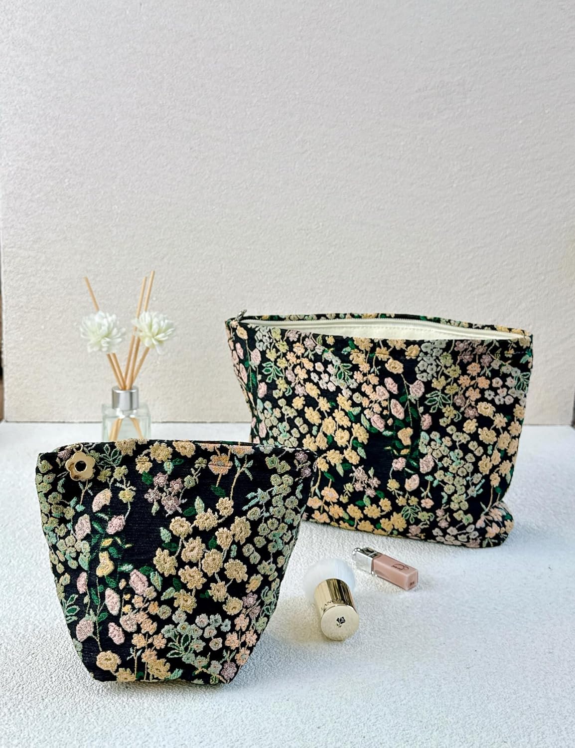 2 Pcs Makeup Bags, Large Cosmetic Bag Travel Toiletry Bag Organizer for Women, Embroidery Craft, Floral Makeup Bag Small Cosmetic Pouch Purse with Zipper Gifts for Girls Teen