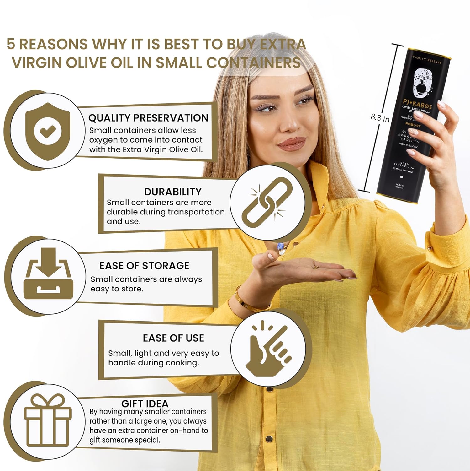 - 2024/25 Fresh Harvest, ultra-premium, clean taste, hand harvested in October of 2024 (the olive harvest season lasts from September to February of every year, and is named after the new year). Comes in three elegant 16.9 fl oz tins which is easy to store, easy to handle (you don’t need a dispenser bottle or sprayer as it has a great pouring spout). Great business or personal gift idea. Best Before June 2026.