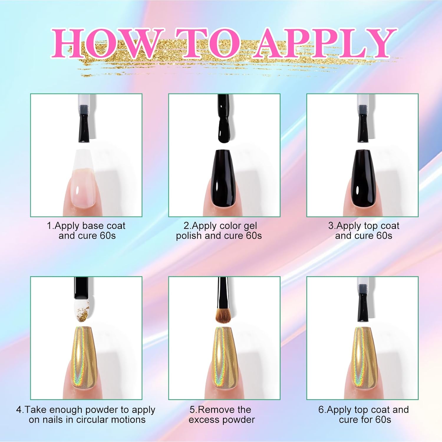 - Mirror Chrome Nail Powder: Make your nails shine like mirrors, moonlight and pearls. You can create different effects with gel nail polish of various colors to make your nails more delicate and textured. Just a little powder and your nails will look different