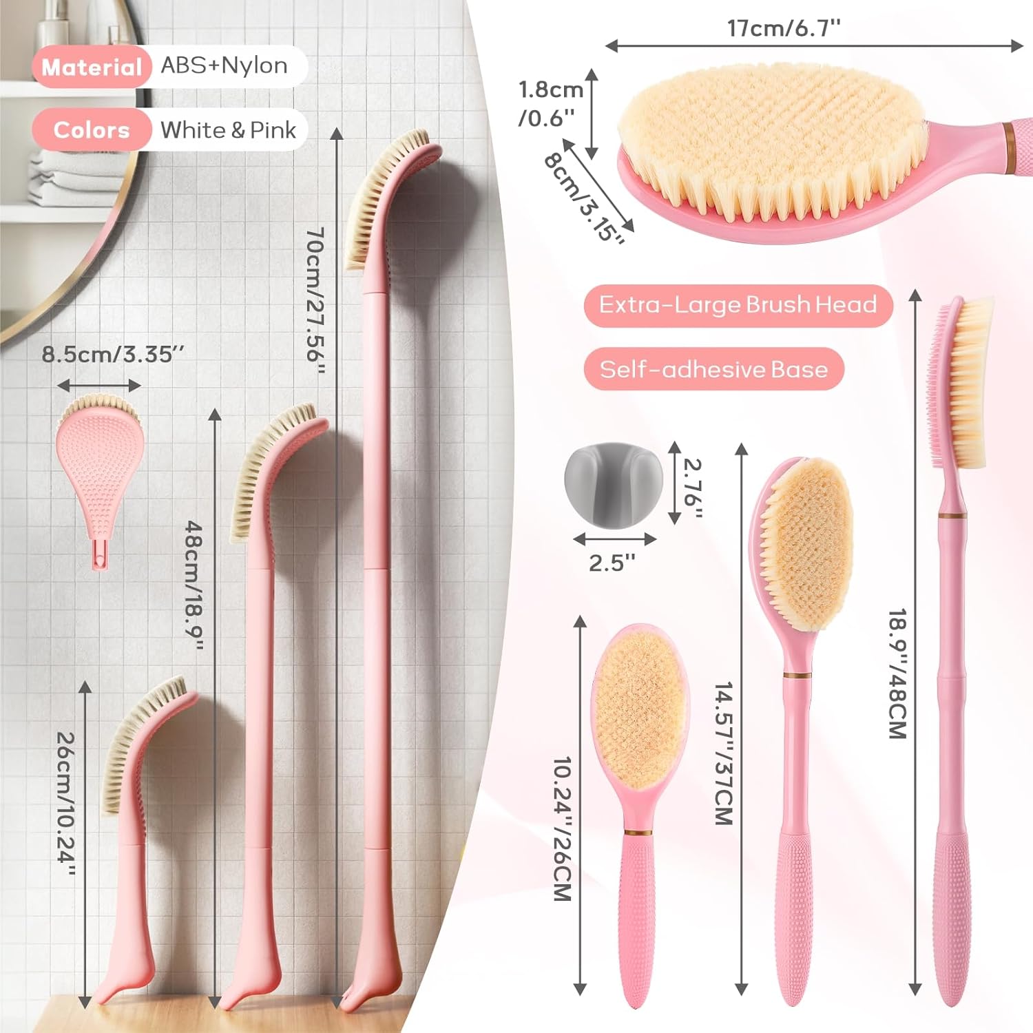 New Foot Brush & Back Scrubber Set 2PCS, 10.2''- 27.5'' Adjustable Foot Scrubber for Shower, 18.9'' Shower Back Scrubber with 3-Length Usage, Great Aid for People with Limited Mobility(Pink)
