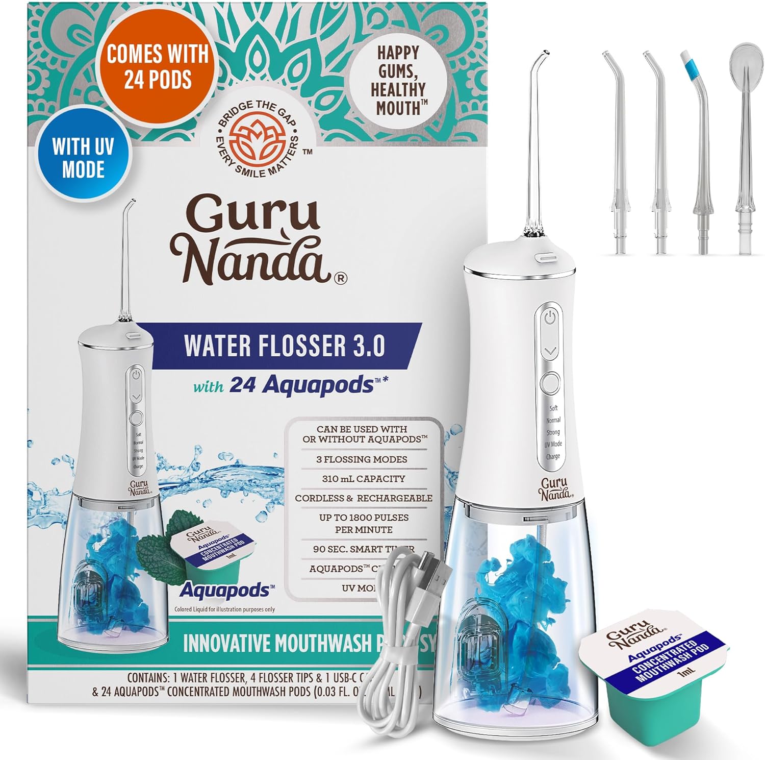 - UNLOCK 2-IN-1 CLEANING: Our GuruNanda Water flosser 3.0 comes with our UV-Powered Flosser & 24 premeasured Aquapods with concentrated mouthwash, so that you unlock minty-fresh breath while deep cleaning your mouth with our flosser.