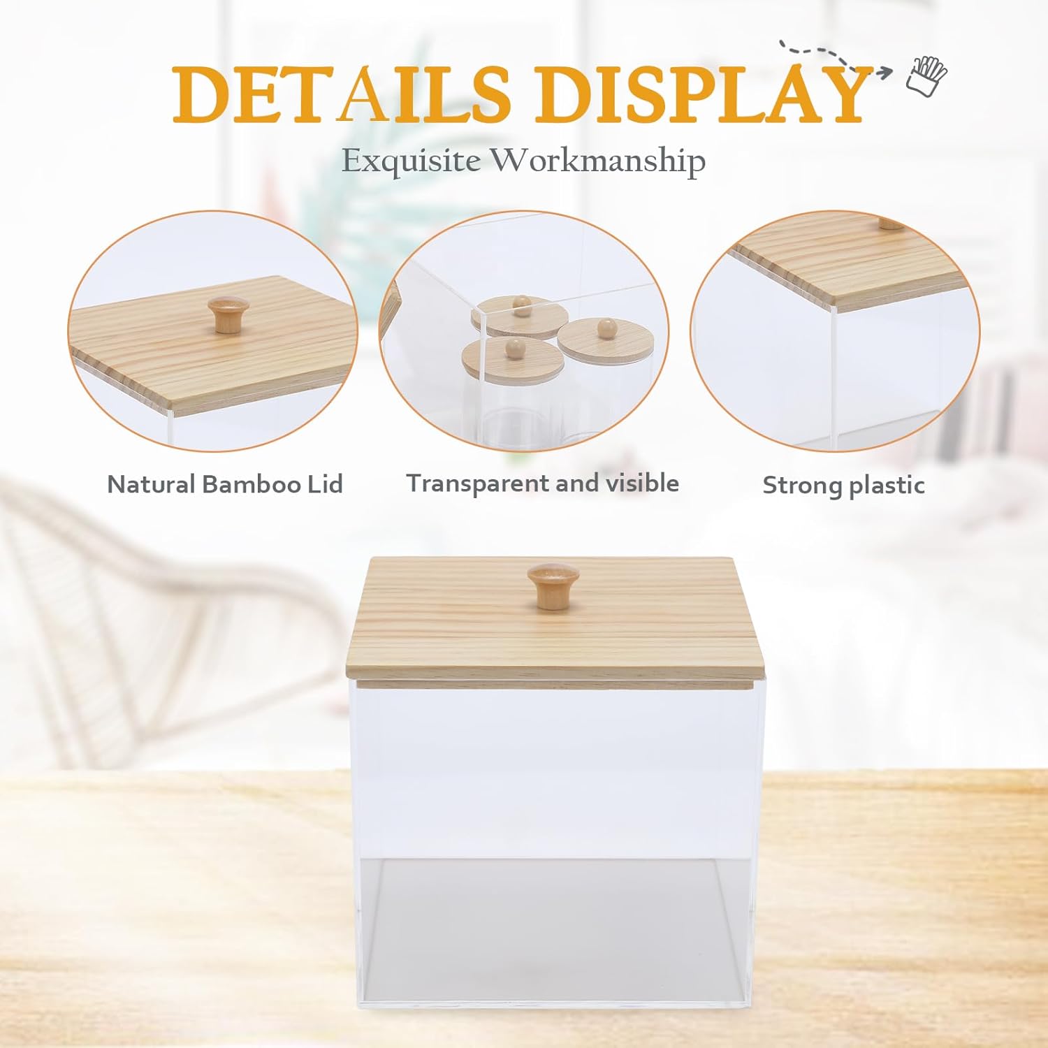 - Attractive and Durable: The face towels holder is made of sturdy acrylic, and the 4 pack q tip apothecary jars are made of high quality PS plastic, BPA-Free and more drop-resistant than glass. The lid is made of bamboo and the handle is designed with round beads, which is a combination of hand feeling and aesthetic feeling. While being practical, it also makes the jar more beautiful.