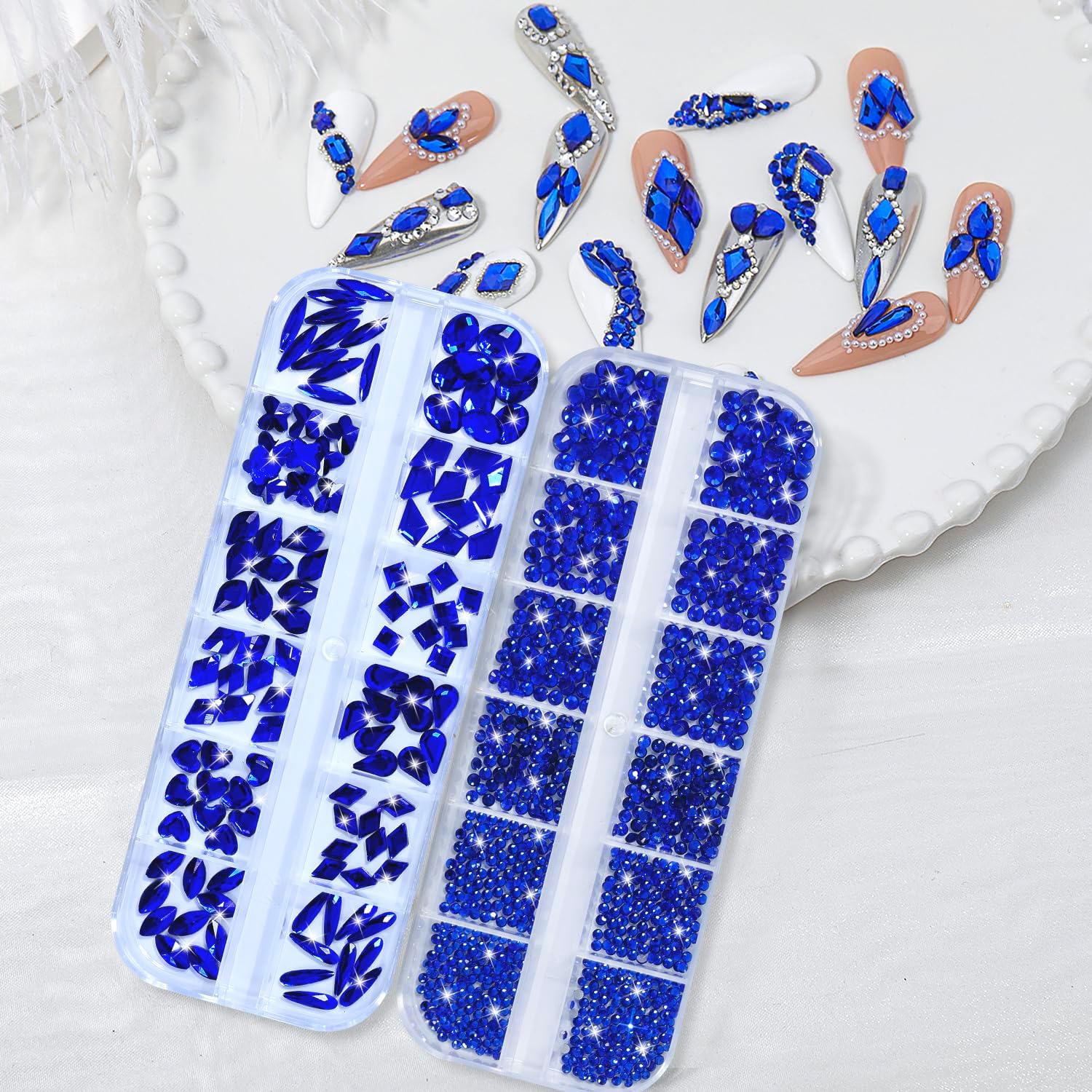 Nail Rhinestones - 3D Multi Shape Size, Flat Back, Crystals Manicure Rhinestones Charms, Blue Nail Gems, with Kit, for Nail Art, Bedazzling Acrylic Nails, DIY Decor