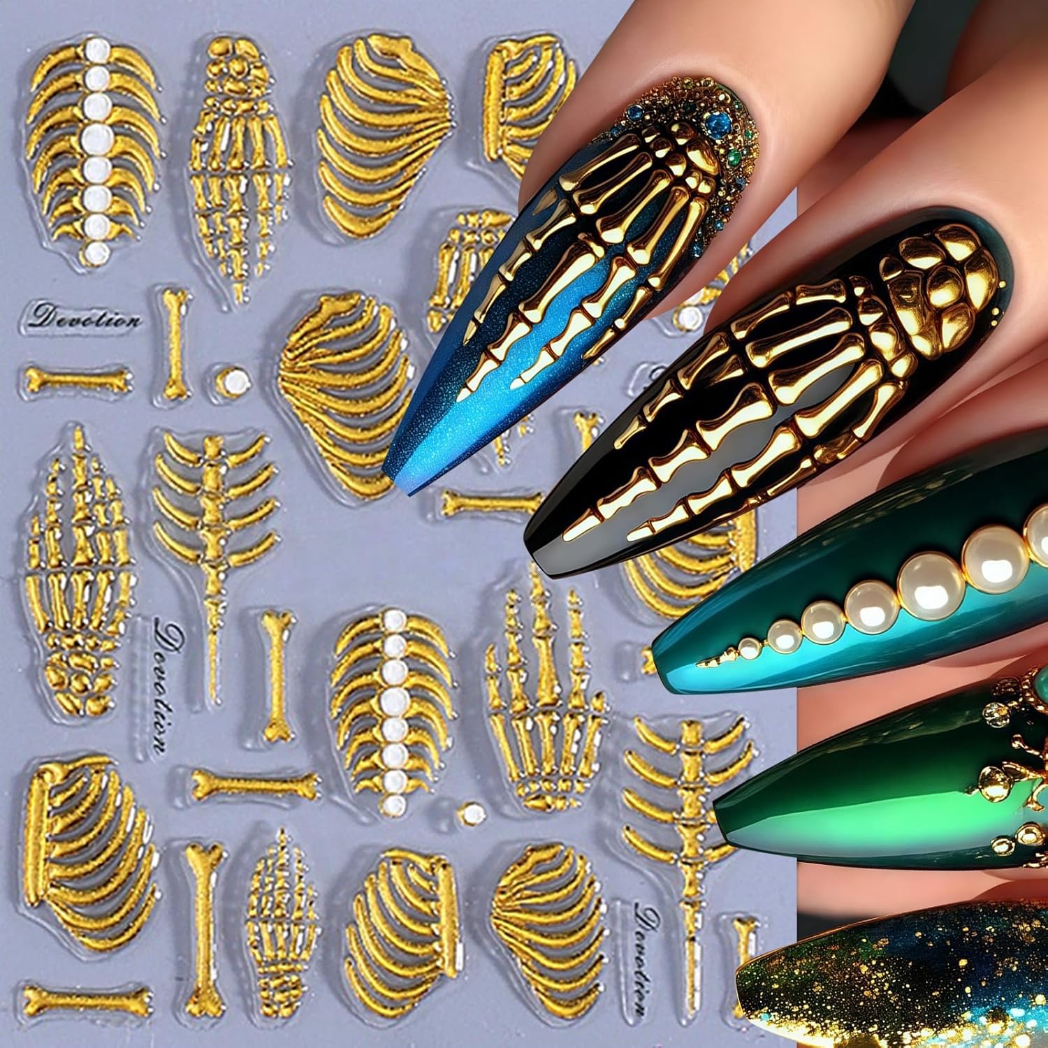 - Easy to Use: This skeleton hand bone nail stickers for nail art is self-adhesive. just use tweezers to tear off the cute nail stickers, and then stick the 5d nail stickers on the nail.You can also use nail gel to cover to make the beautiful stickers last longer