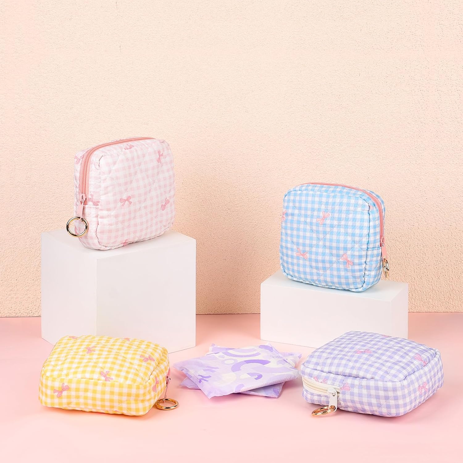 Period Bag for Teen Girls, Quilted Sanitary Napkin Storage Bag, Cute Bow Tie Menstrual Pad Pouch Tampon Holder (Plaid Yellow)