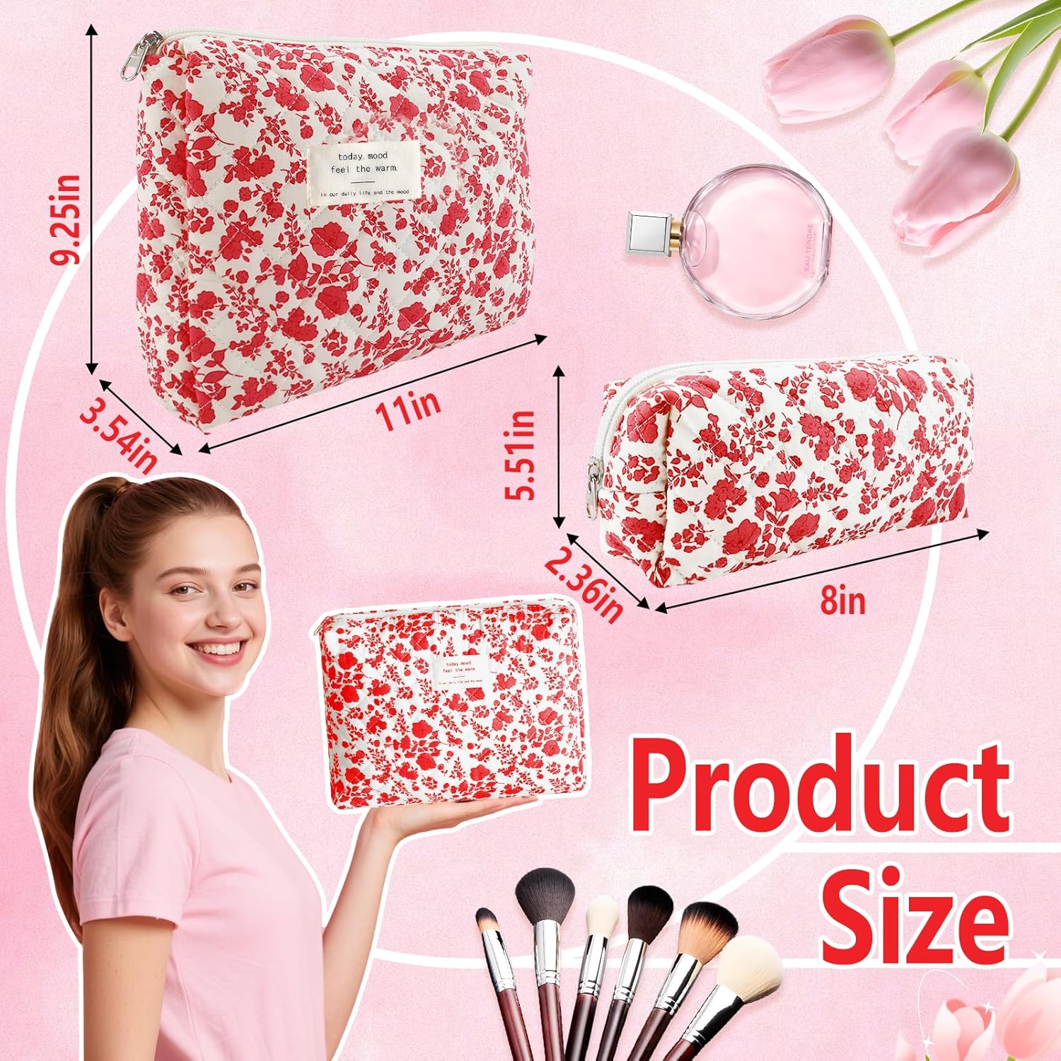 - TRAVEL MAKEUP BAG SET COQUETTE FOR WOMEN:You will get a large makeup bag and a small cosmetic bag (makeup brush bag).These floral makeup pouch is lovely and fashionable, the texture is lightweight and soft. These floral makeup pouch is cute and fashionable, lightweight and soft, easy to carry.Cute flower pencil case,pink pencil pouch
