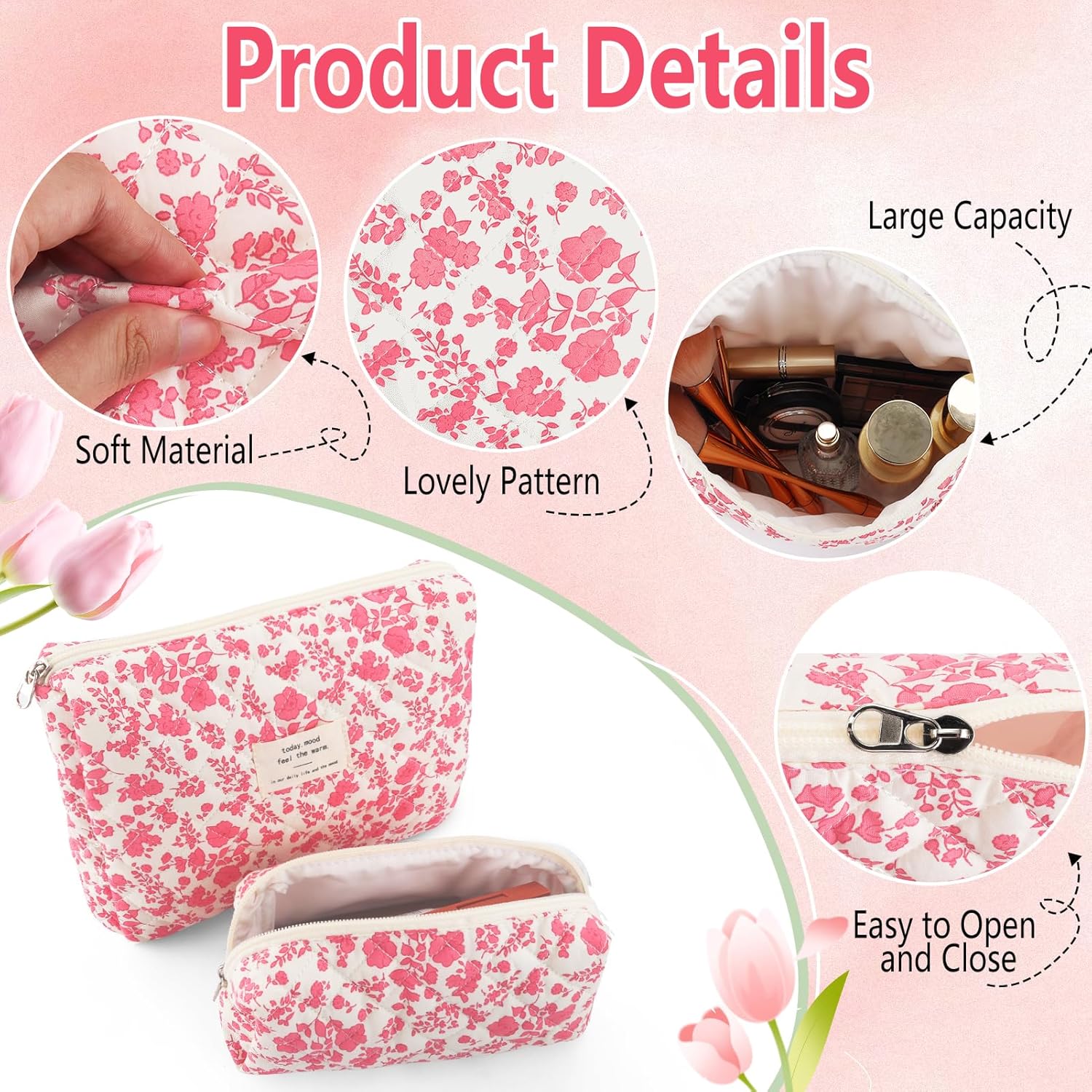 2Pcs Quilted Makeup Bag Set Flower Cute Pencil Case Large Small Travel Makeup Pouch Set for Women Coquette Makeup Bag Aesthetic Cotton Cosmetic Bag Pink Toiletry Organizer Storage Bag Big Zipper Pouch