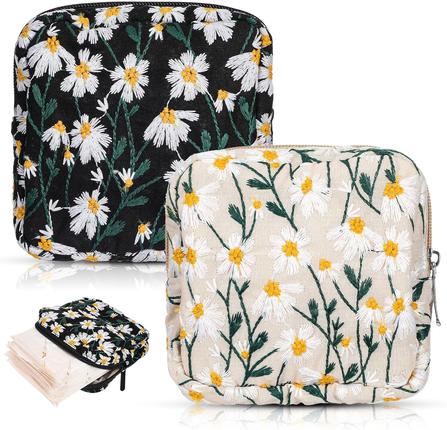 2 Pcs Sanitary Napkin Storage Bag, Daisy Embroidery Period Bag, Soft Tampon Holder, Portable Period Pouch First Period Kit for Women Teen Girls 9-12