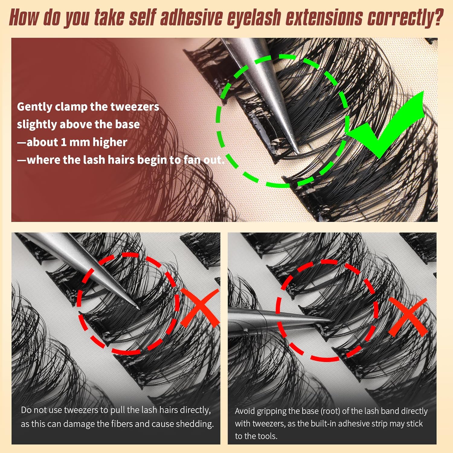 - No Glue Eyelashes - Self-Adhesive Lash Clusters for Instant Wear: Our no glue lashes feature self-adhesive eyelash clusters with pre-applied invisible self-adhesive strips. These pre-glued lashes extensions eliminate messy glue application - simply peel and press these stick on eyelash extensions directly onto your lash line. The press on lash clusters stay put all day without slipping, making them perfect for DIY individual lashes beginners and pros alike.