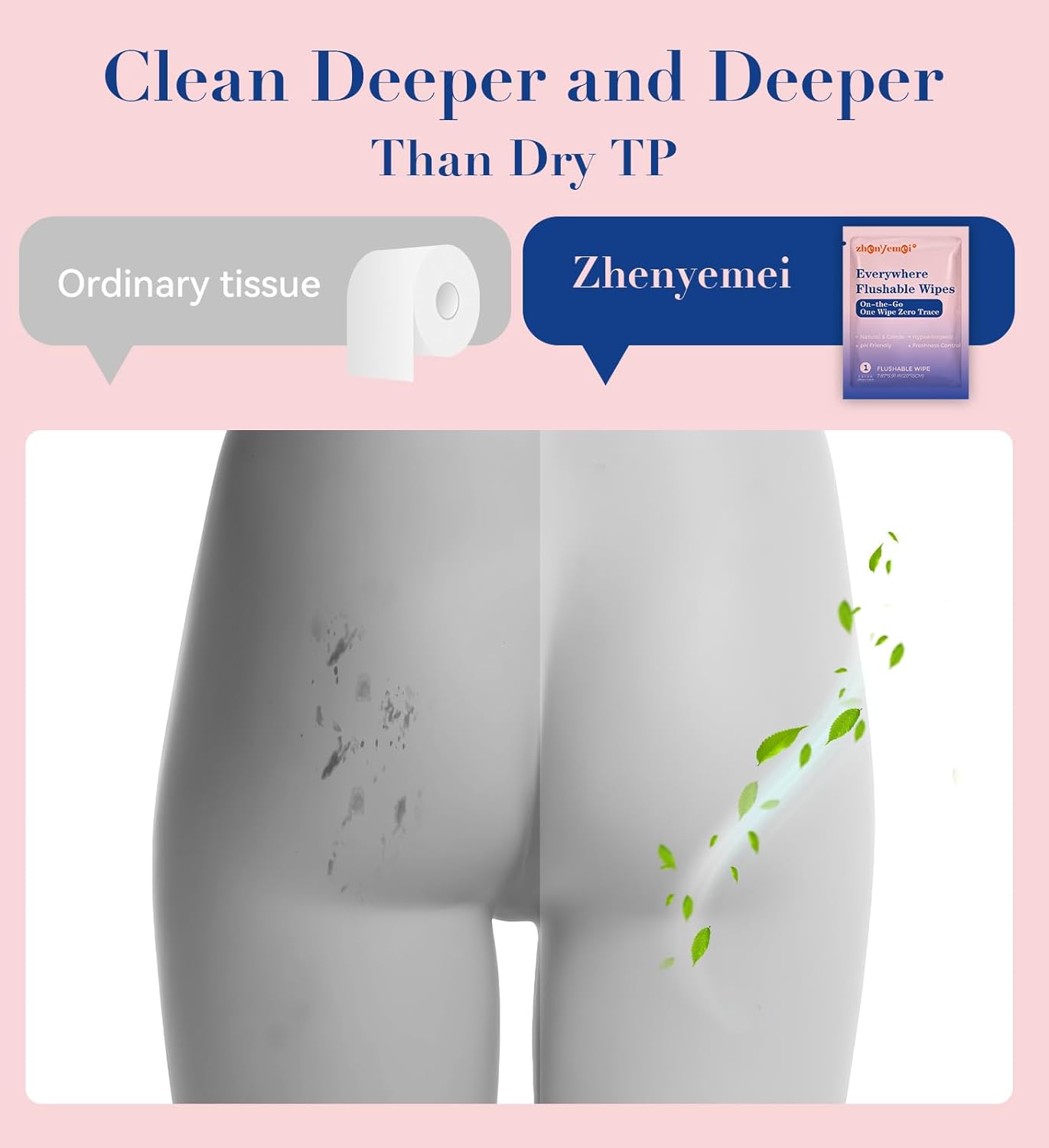 - 【HYPOALLERGENIC FORMULATION, EFFECTIVE CLEANSING GENTLELY】: ZHENYEMEI Flushable Wipes with natural ingredients are gentle on your sensitive skin while effectively removing dirt and odor. Fragrant/Alcohol-Free; pH balanced.