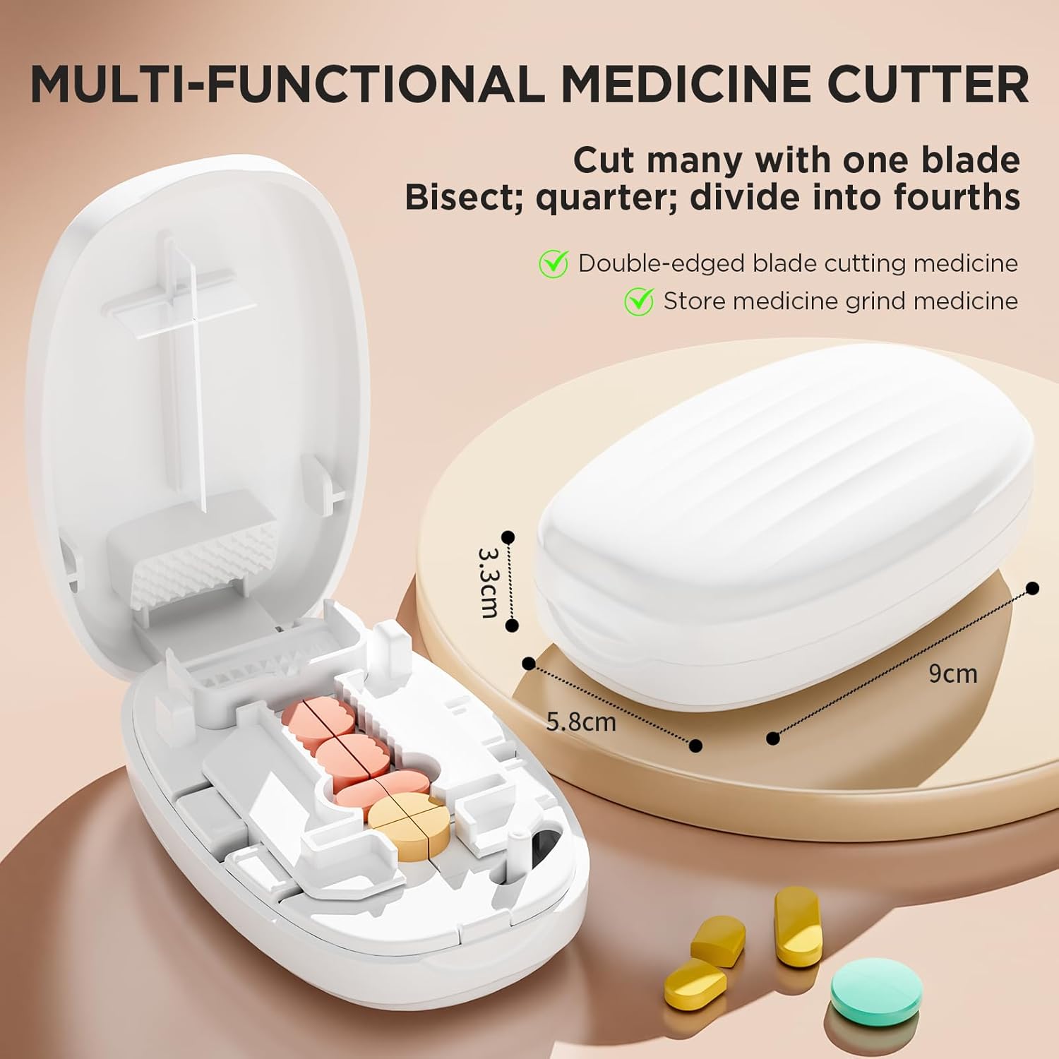 - 【STAINLESS STEEL BLADE】: Precision-crafted stainless steel blade delivers clean, accurate splits every time. Durable and reliable for consistent medication dosing, making pill cutting easy and effective with long-lasting performance