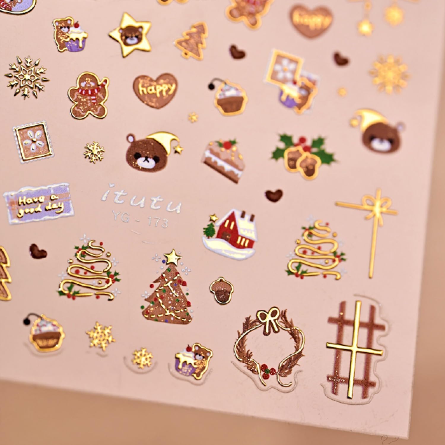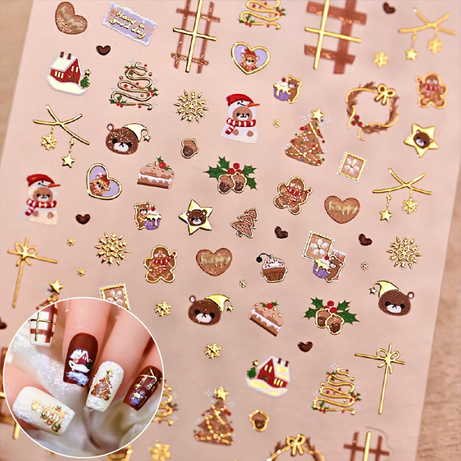 Christmas Nail Stickers for Nail Art Cute Bear Christmas Tree Wreath Glitter Gold Nail Art Stickers 5D Embossed Winter Nail Decals 3D Self-Adhesive Nails Supply Manicure Sliders for Nails Decoration