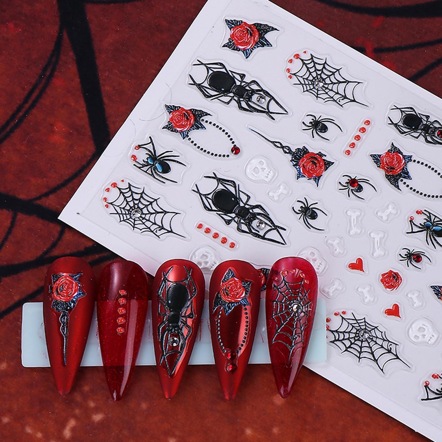 Red Black Halloween Nail Art Stickers Decal 5D Embossed Flower Spider Web Nail Stickers with Rhinestones Bow Blood Drop Nail Decals Self-Adhesive Spider Nail Art Decal for Women Halloween Decor