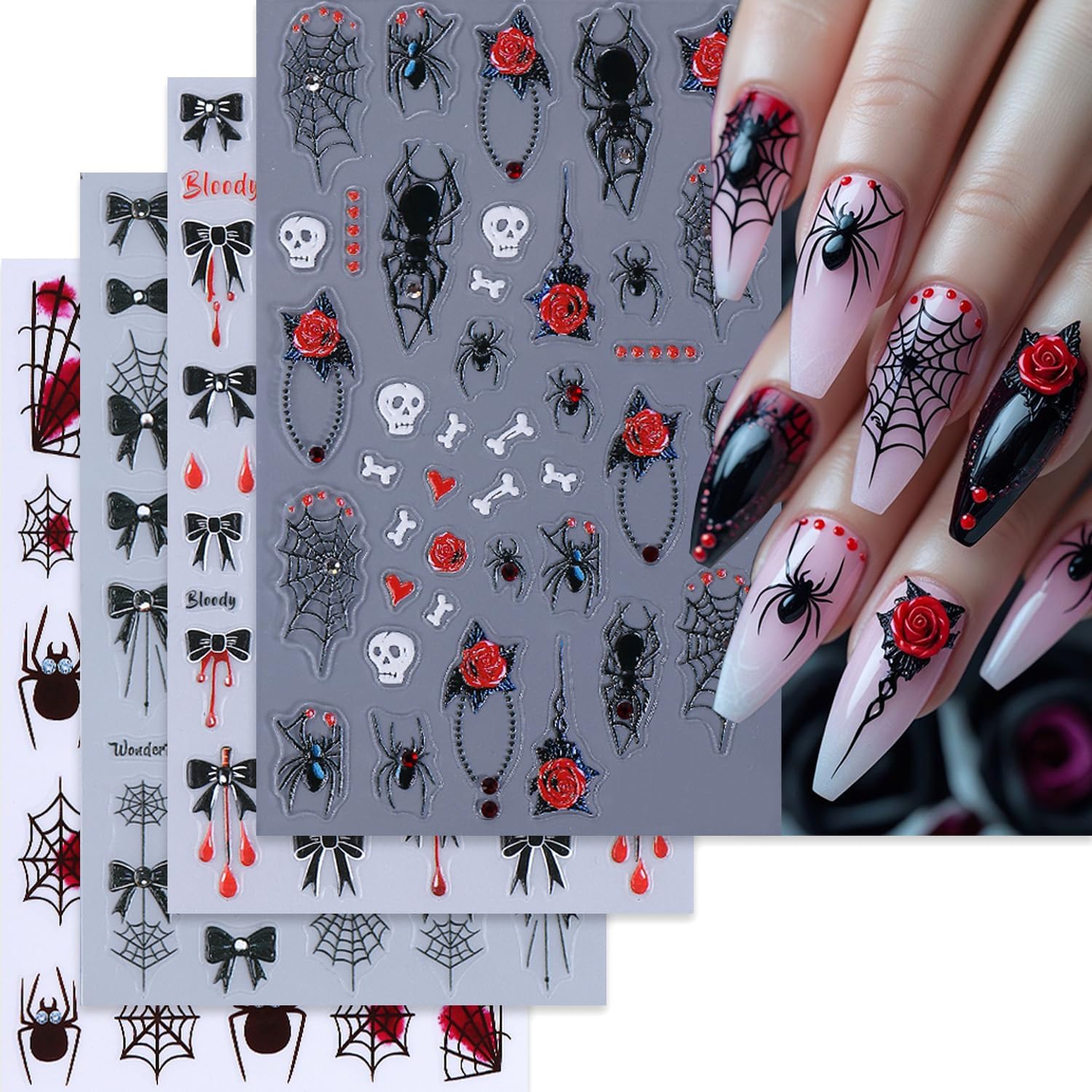 - Quantity: You will get 4 sheets of Halloween skull nail art stickers, including bow and spider web pattern designs, not easy to fall off or fade, can easily create a variety of themed nail art