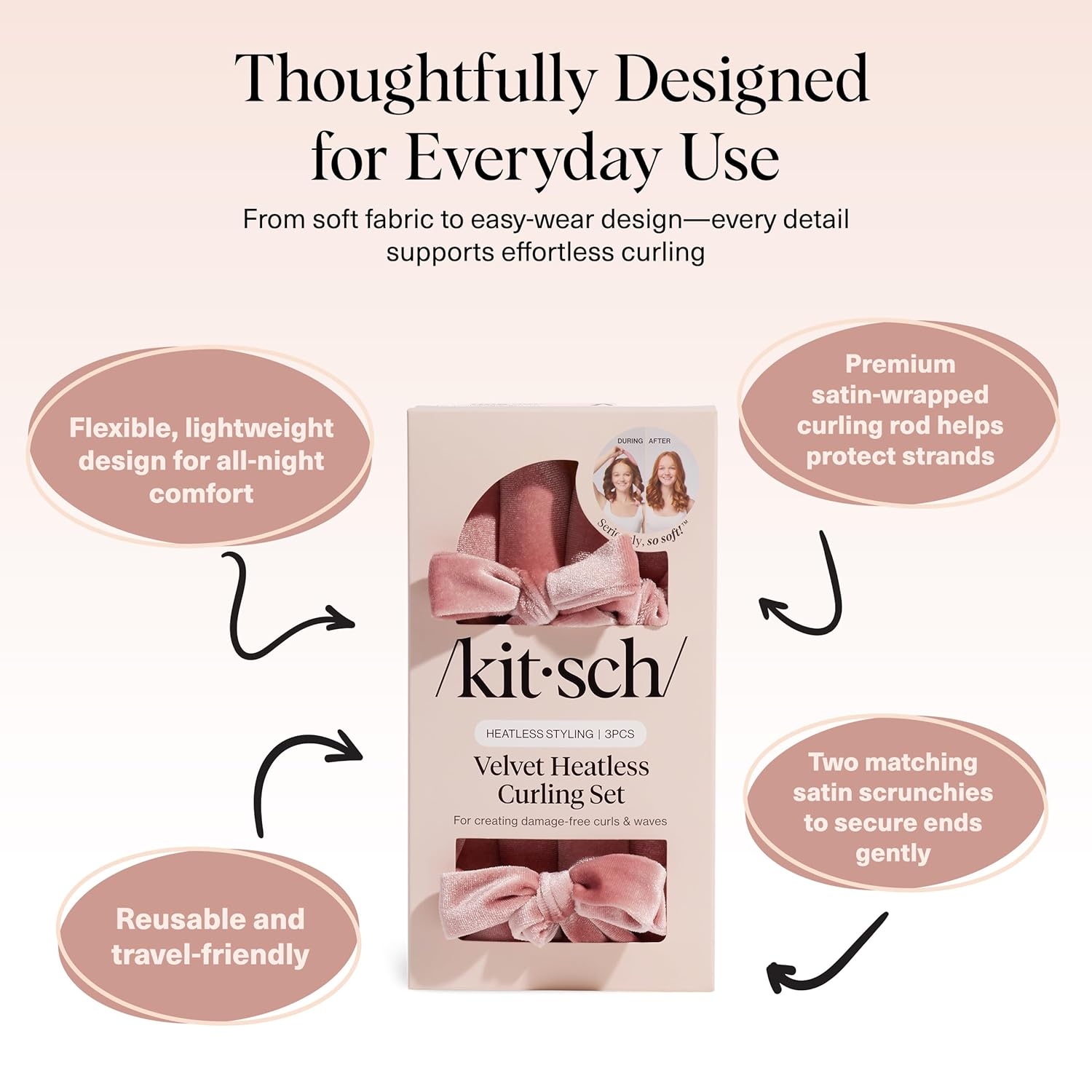 - SOFT VELVET HEATLESS CURLING ROD – Made with extra-soft velvet, our heatless curling rod gently grips even freshly washed strands while keeping them smooth and crease-free. Comfortable enough to wear day or night, it’s designed to deliver silky, long-lasting overnight curls.