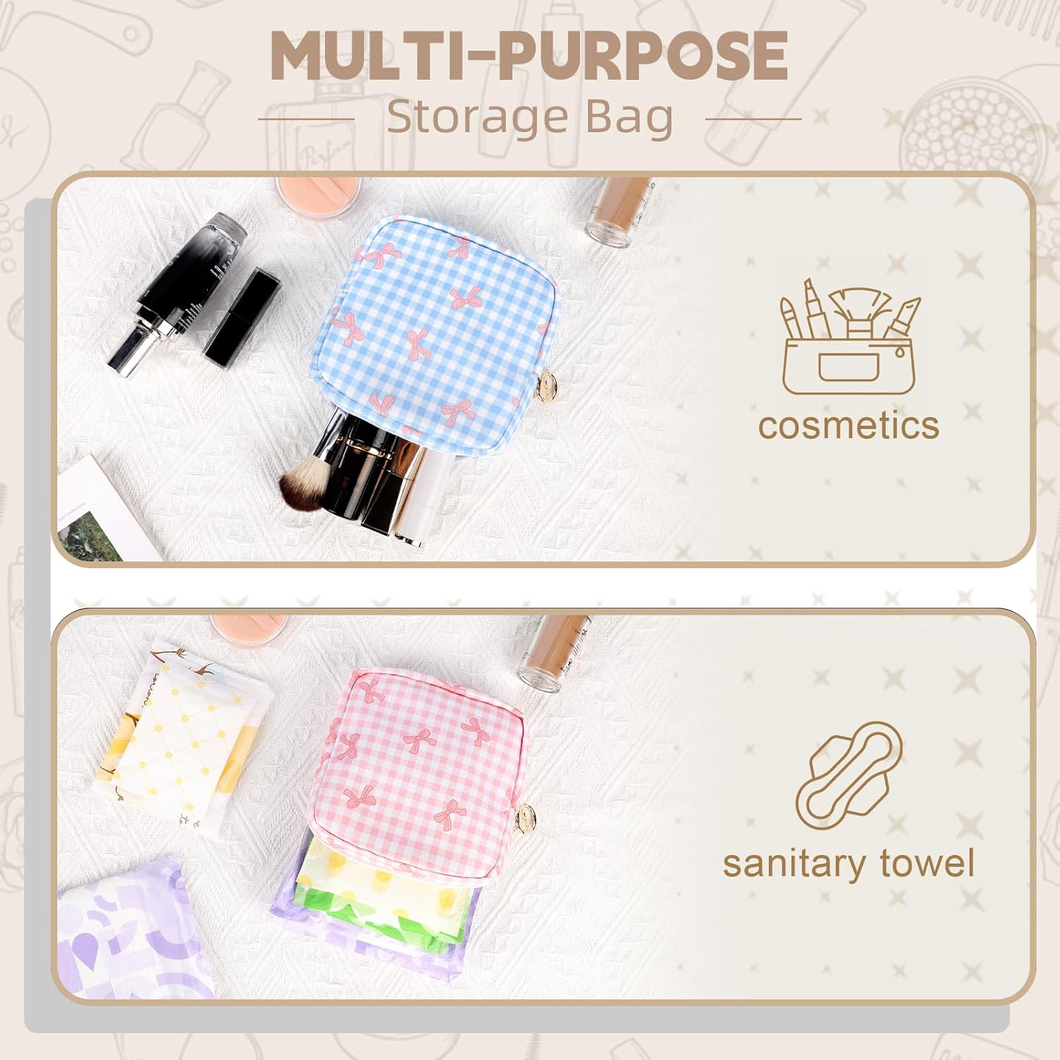 - 【Cute & Colorful Colors】Tampon holder is available in your choice of colorful color and sizes, checkered and bow tie styles gives it a distinctive cute look. Pad storage bag make of canvas fabric, soft, comfortable to touch, easy to clean, no fade