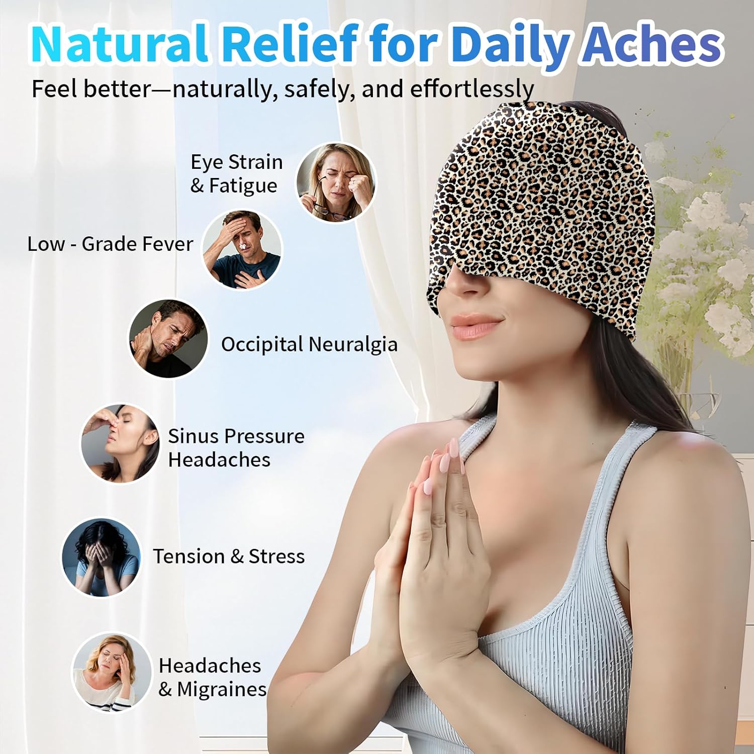 Migraine Relief Cap,Headache Relieve Cap,Leopard Print Reusable Gel Ice Head Wrap Cap for Tension,Stress,Hangover & Puffy Eyes.