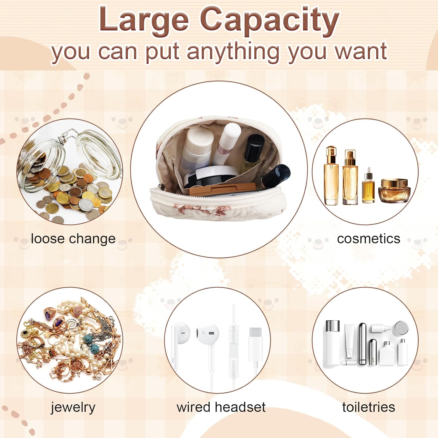 Small Quilted Cotton Makeup Bag for Purse Mini Cosmetic Period Bag for Women Cute Small Bear Makeup Sanitary Pouch Portable Travel Toiletry Bags with Zipper Slip in Pockets Birthday Gifts