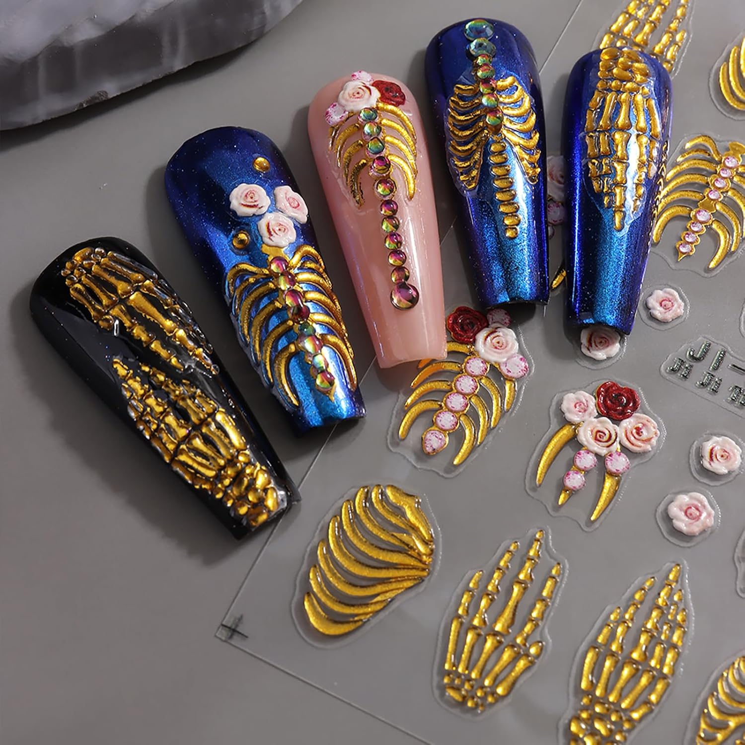 Halloween Nail Art Stickers Decals 5D Skeleton Hand Nail Decals 3PCS Embossed Self-Adhesive Spooky White Rose Gold Skull Design Gothic Holiday Nail Charms for Women DIY Manicure Accessories Supplies