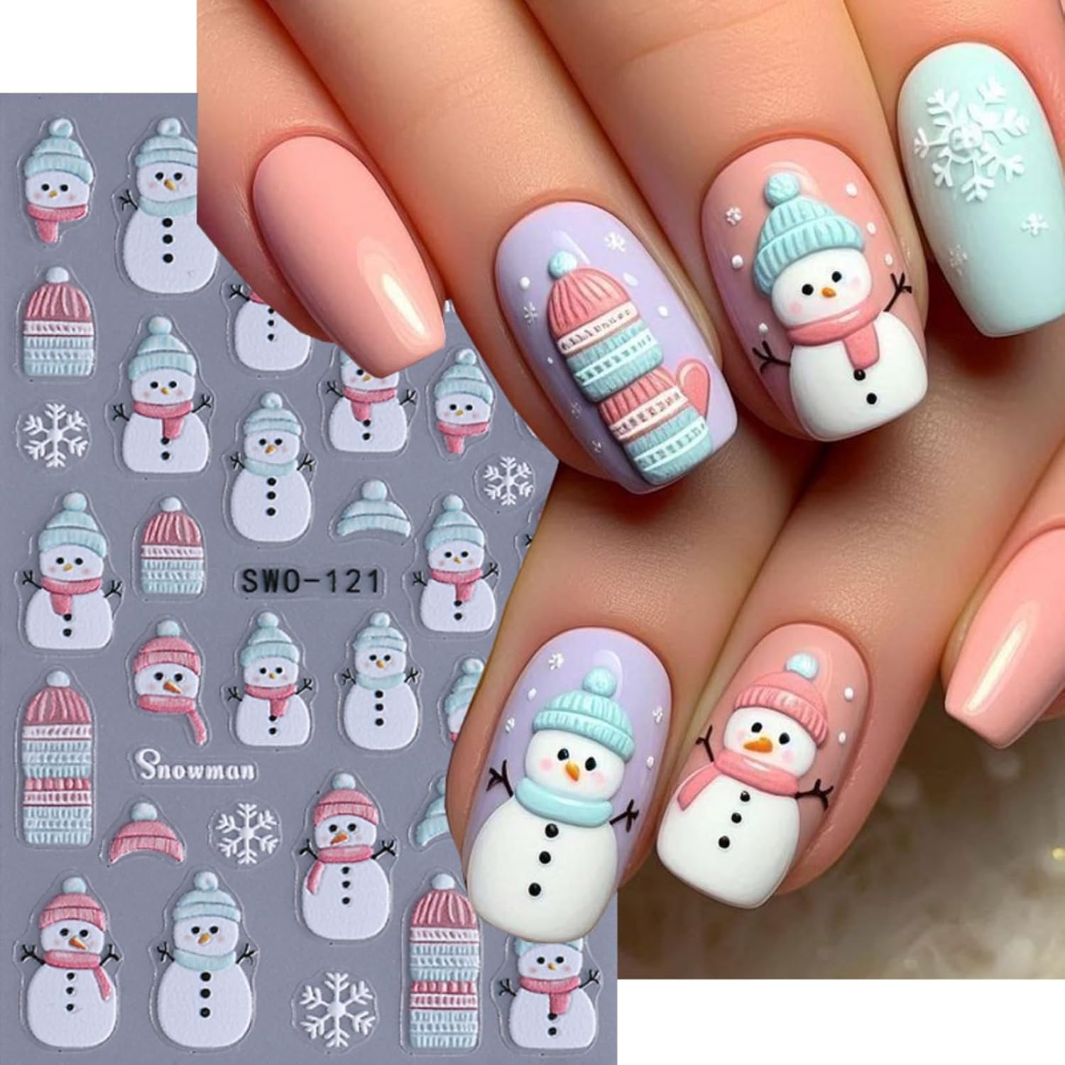 2Pcs Christmas Nail Art Stickers Decals 5D Embossed Winter Nail Decals Snowflake Nail Stickers Pink Blue Hat Scarf Snowman Nail Supplies New Year Winter Nails Supplies for Women Manicure Decoration